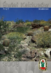 Nowości w świecie kaktusów - Tadeusz Nycz Rodzaj Parodia - Andrzej Mucha, Henryk Sobka Coryphantha na swoich stanowiskach - Grzegorz Matuszewski Rodzaj Pelecyphora - Grzegorz Matuszewski Na stanowiskach naturalnych Melocactus oaxacensis - Przemysław Hadasz Mammillaria marcosii - Przemysław Hadasz Pierrebraunia nowy rodzaj? - Tadeusz Nycz Marginatocereus - Stanisław Hinz Coryphantha sp. Griegos - Grzegorz Matuszewski Na stanowiskach naturalnych Sempervivum soboliferum - Przemysław Hadasz Kto pamięta jeszcze Salina Cruz? - Grzegorz Matuszewski Uroda echinocereusów - Echinocereus schmollii - Przemysław Hadasz Nazwy kaktusów - zasady nazewnictwa i znaczenie nazw - Krzysztof Wiktorowski Pelargonium - Stanisław Hinz Dasylirion - Stanisław Hinz Kaktusy w internecie - Mieczysław Siwiec Znasz li ten kraj gdzie opuncja dojrzewa... - Anna Henderson |
